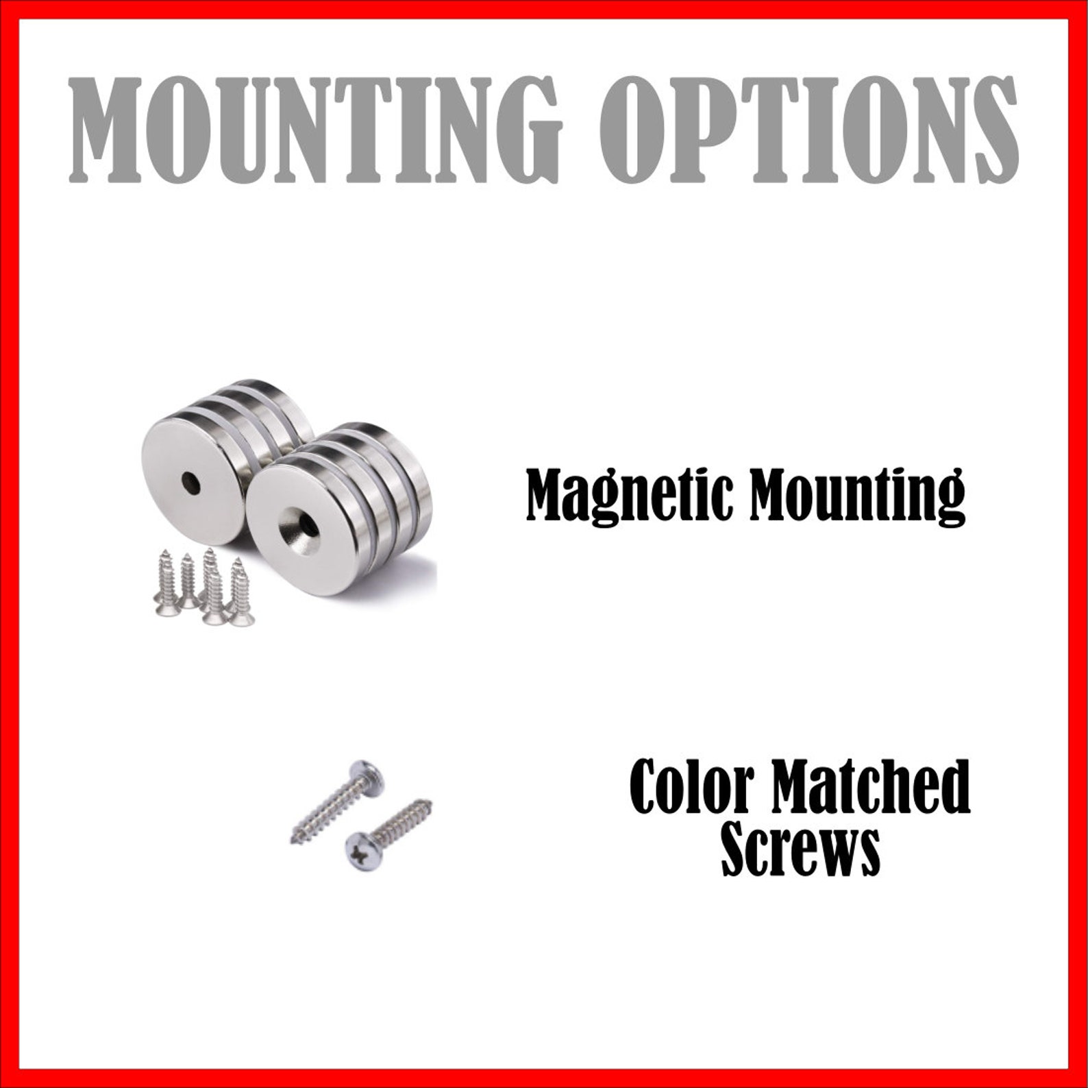 * Magnetic Mount Kit = Rare Earth Cup Style Magnets with Screws Provided. These can be installed on almost any surface and will hold up to 100 lbs. Perfect for attaching metal holiday or seasonal signs. Simply attach the magnet to your surface and change your sign with every season without damaging or piercing your signs.
