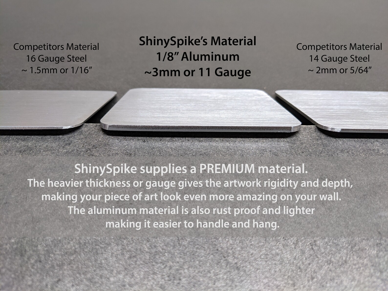 All our artwork is made from Aluminum! We us a 1/8 material which is approximately 3mm thick or similar to an 11-gauge steel. Aluminum offers you a high-quality product that will not rust. It is also lighter and therefore easier to handle and hang on your wall, while still maintaining its strength and rigidity. Each piece is finished with a textured black powder coat to give you a consistent and beautiful finish.