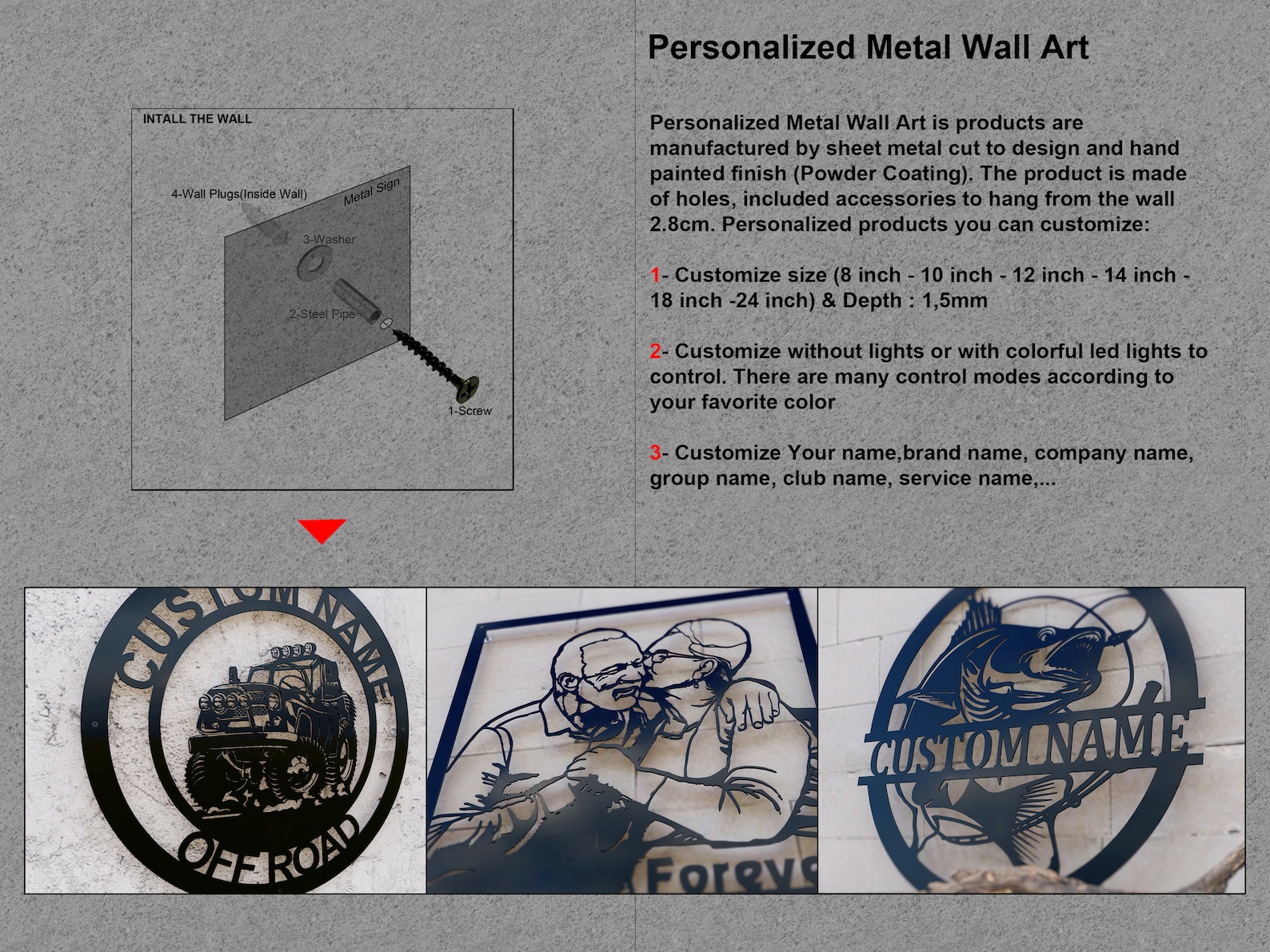 *Personalized LED Light Metal Sign is products are manufactured by sheet metal (Depth : 1,5mm) cut to design and hand painted finish.The product is made of holes, incl accessories to hang from the wall 2.8cm.Personalized products you can customize: