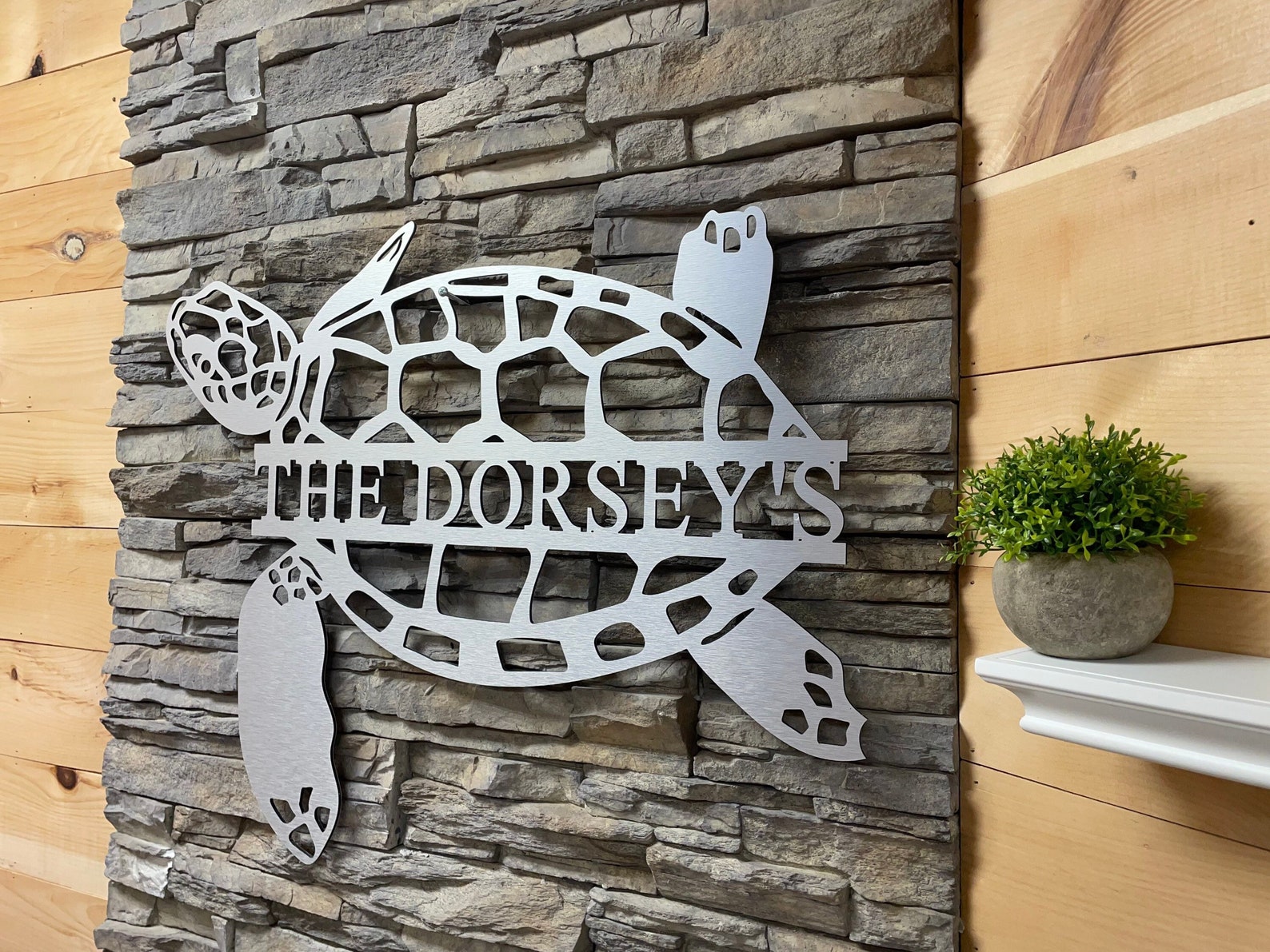 Our personalized sea turtle sign is priced just right. Our collection of several unique coastal designs is manufactured from an ACM aluminum composite multi-ply material (see photo). This 12-22-or 30-inch personalized sign features turtle decor art as shown in the main image. These one-of-a-kind gifts also come in the color choice of black, white, or brush. It includes a durable outdoor finish. These signs are made to order & ship fast! This custom-made piece of metal art is produced right here in the USA in our hometown of Eastman Georgia using our state-of-the-art CNC machines. These metal coastal decors are out of this ocean and are always cut to precision & come incl with a stainless-steel hardware mounting kit (see photo). This custom gift is perfect for all your modern decor needs. Our beautiful estate wall art makes a perfect gift for any sea lover of any size or shape. Are you in need of a birthday gift and cannot find anything you like? Dont worry this one-of-a-kind sign makes an ellent gift for any passionate outdoor lover. This custom wall decor is perfect for your bedroom dcor needs. Our one-of-a-kind gift will make a special gift for any occasion. This monogrammed sign is perfect as your new living room dcor too. The possibilities of what you can do with it are only limited by your creativity. These aluminum signs are great to use indoors as well as they will compliment all different interior styles of homes from modern city house decor to farmhouse decor. If you use this sign as an outdoor sign, it will be weather durable and is rustproof. This unique work of art makes a great wall accent for you or someone you know. Because our prices are so low it will make you think that you got some new turtle clearance!