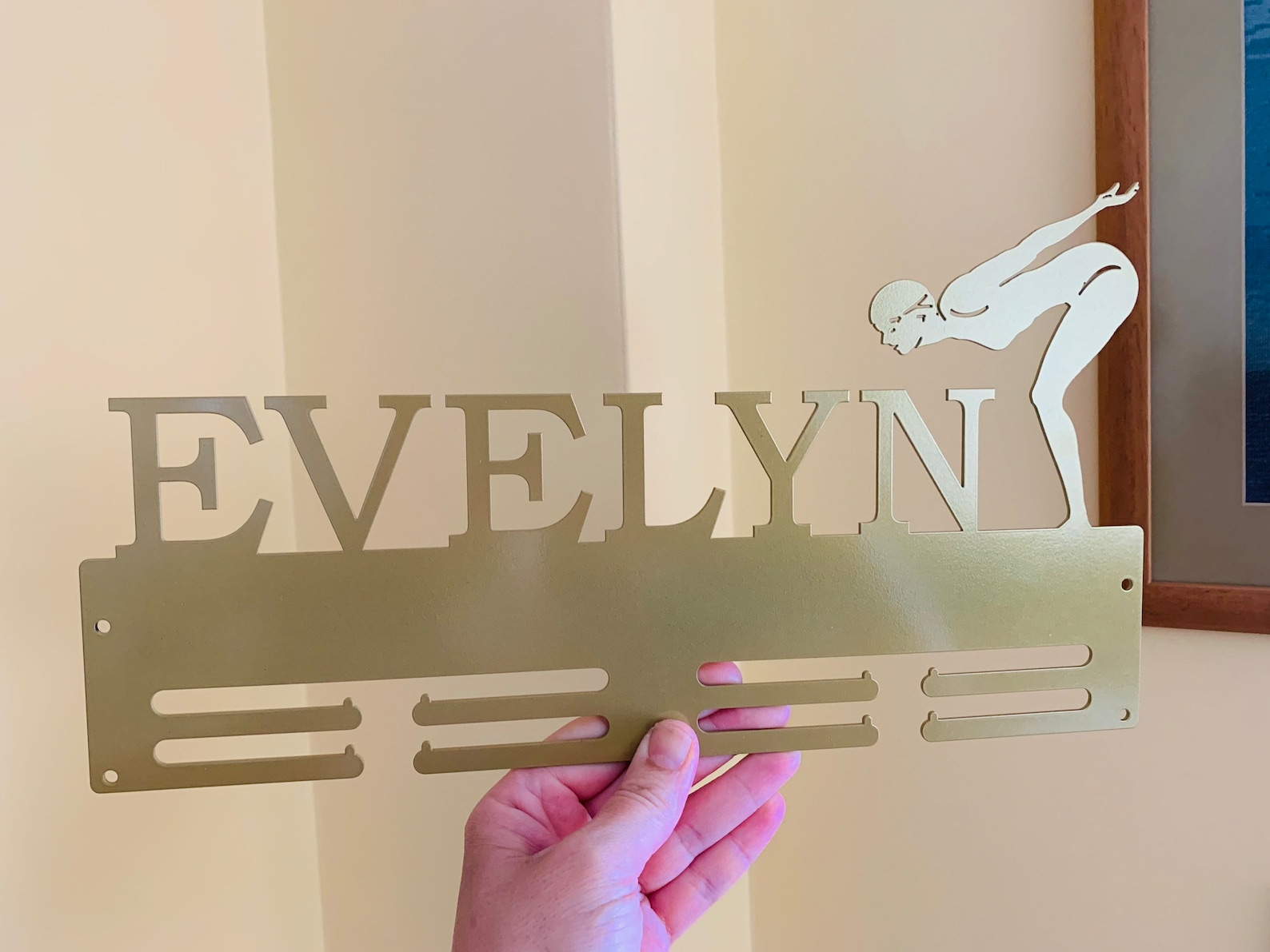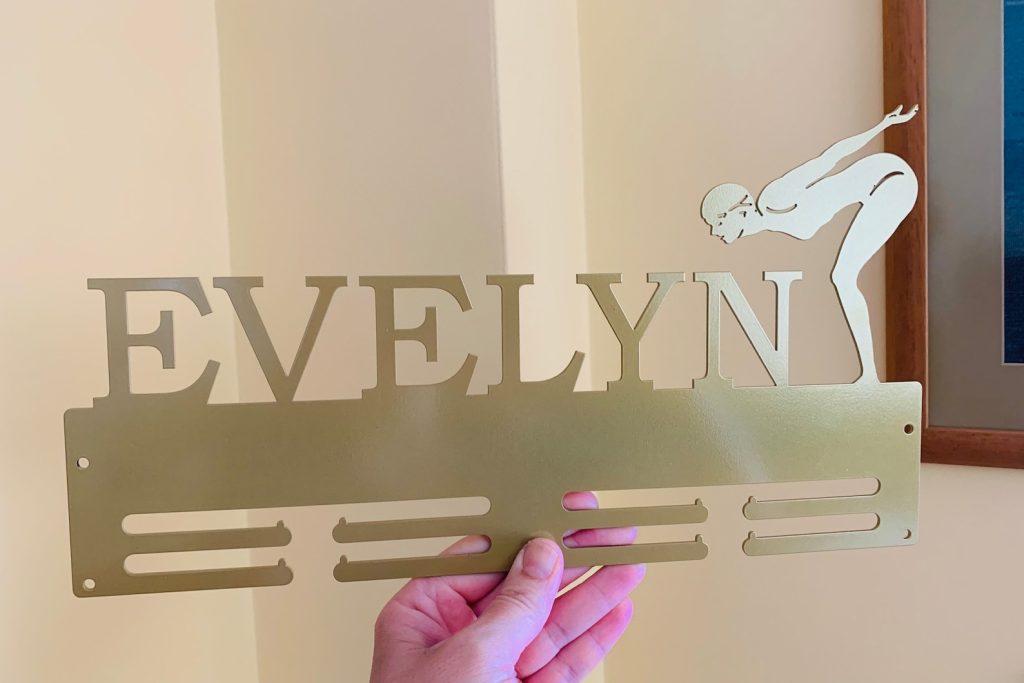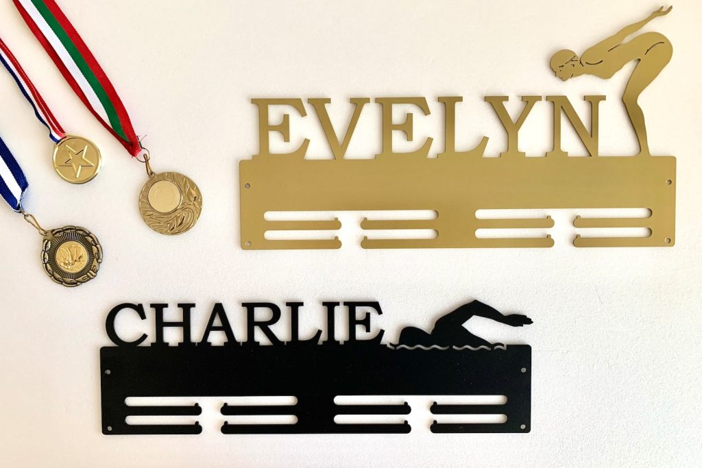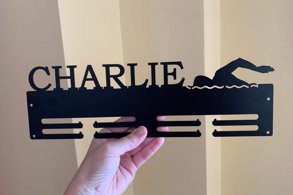 This personalized swimming medal holder with a custom name is the best way to display all that you have been collecting from the championship circuit.