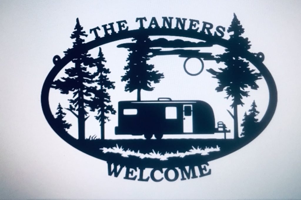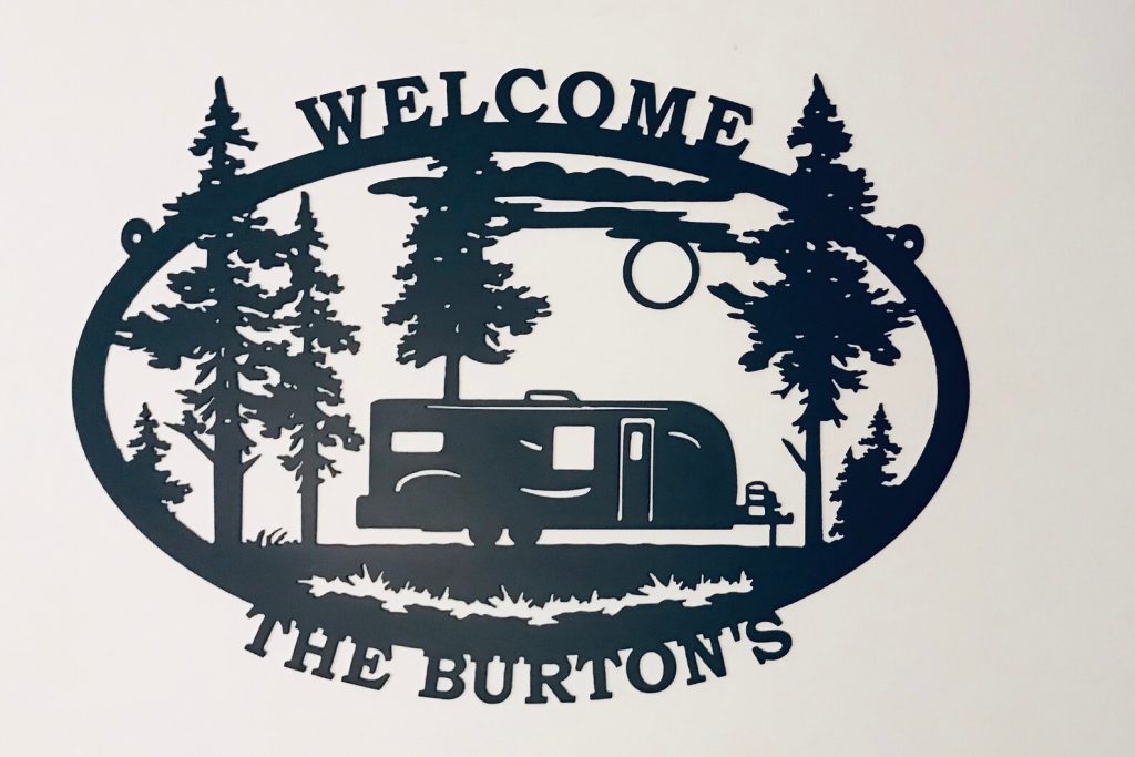 Welcome Personalized 1 Door Travel Trailer Camping sign for outside or inside use. Great for camp ground or home. 16 gauge steel, powder coated black. Each sign is individually made and not mass produced. Can be hung flat on a wall, fence, gate or hung from chains. Also available with Bienvenue. Non personalized option also available.