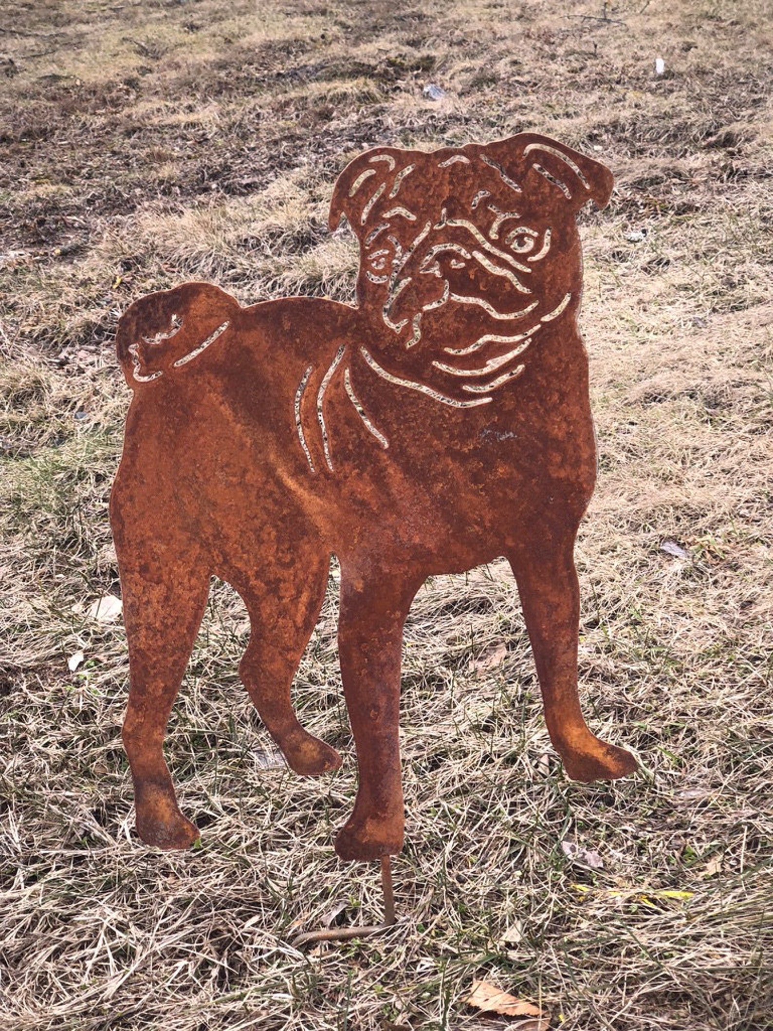 This handcrafted rustic metal Pug Garden Stake or Wall Hanging (option) will become a decorative favorite. A charming way to add some fun to your home, lawn or outdoor garden decor.
