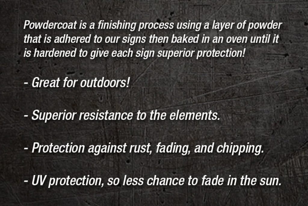 – Clear: Gives a more industrial look to the sign. Dark gray in color with markings such as patina, scratches, or grind marks from the cleaning process that are unique to each metal sign. The steel is then painted with a clear coat to help protect it from rusting.