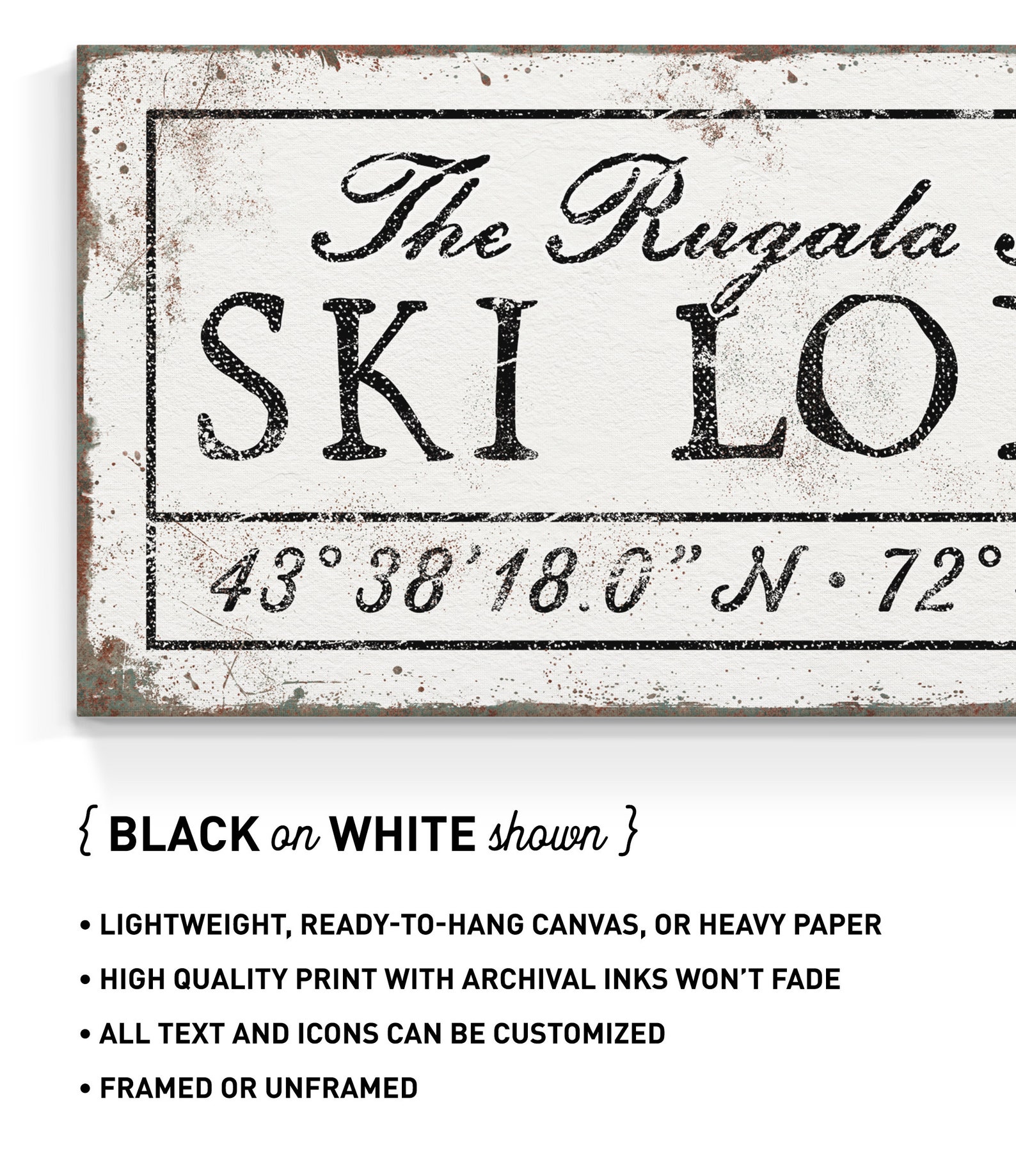 Be the first to review “SKI LODGE Sign – Latitude & Longitude Faux Rusty White Metal Farmhouse Decor”