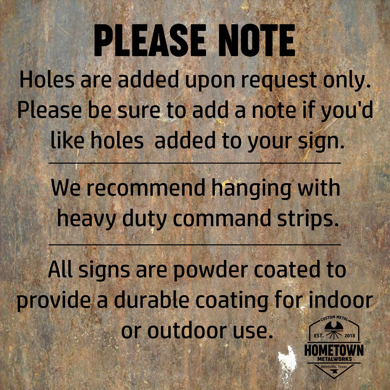 Please Note: Each sign is unique and custom. Some imperfections from the cutting and cleaning process may be found in the metal. All sales are FINAL. Please contact us if you are not completely satisfied with your finished product.