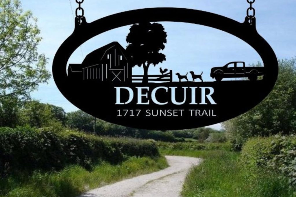 Rustic, personalized metal sign with farmyard scene . Measures 3 ftx 20". Powder coated black or beautiful copper acid and clear coated. LEAVE NOTE TO SELLER WITH NAME AND OR EST. DATE YOU WANT ON SIGN, . PROOF PROVIDED NOTE! If you order brushed metal, it will rust within a short time since theres no UV block, unlike black which is a solid finish