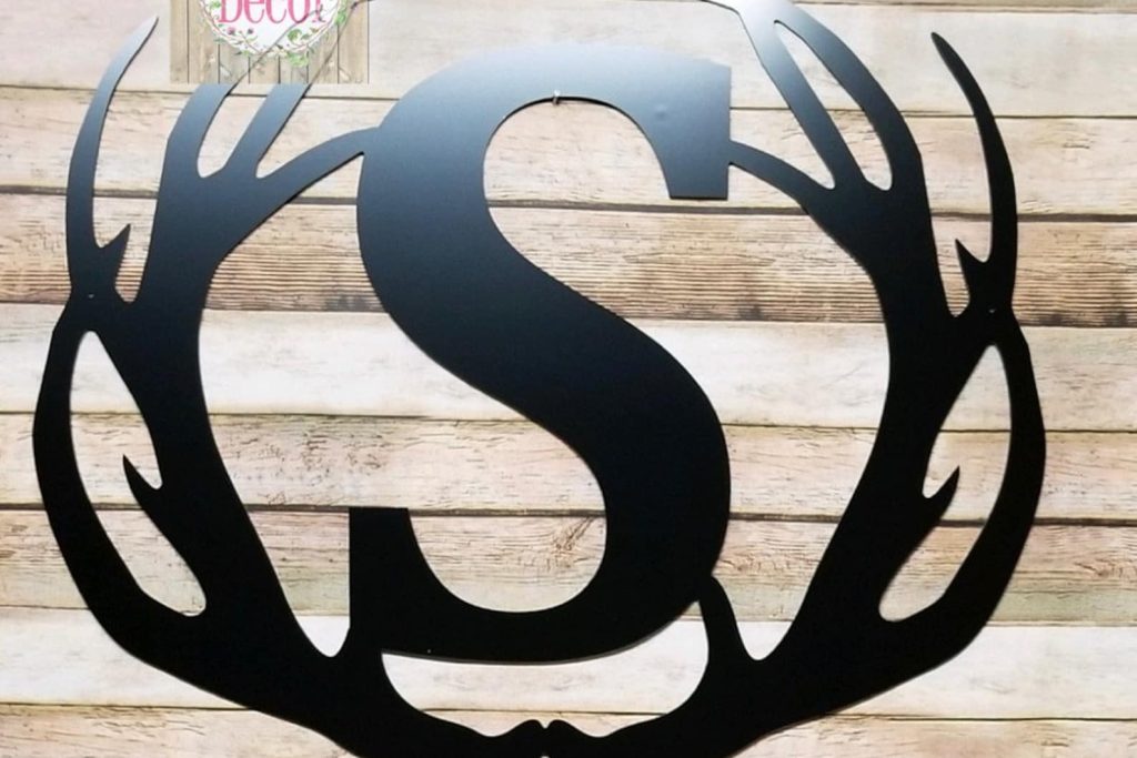 This Antler Monogram Sign can be customized with vine script font or block font, with a variety of color options and mounting options to help you display inside or outside your home. Our unique metal acm material is weatherproof and will last! Read about this material below.