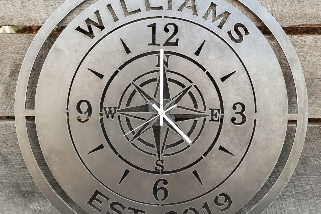 Let this personalized metal wedding clock add some nautical charm to your home. This rustic steel clock with a compass rose design and your family name is the perfect piece to add some decoration and functionality to your wall. Don9;t let time be a bother any longer!