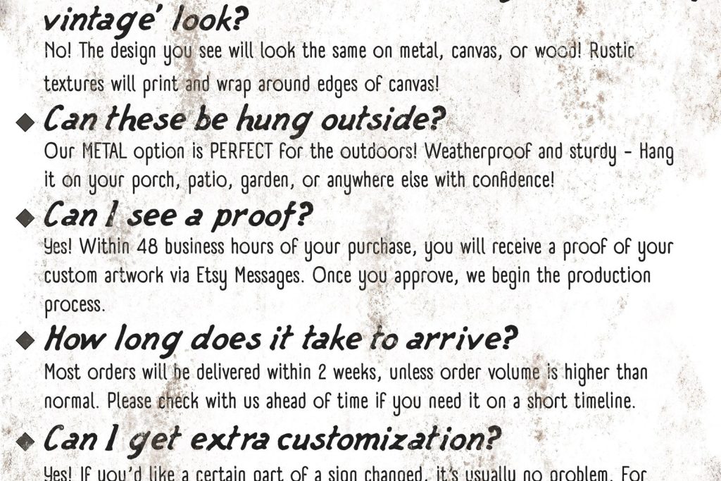 The rustic and weathered textures you see in the artwork will look the same no matter what item you order on. That means metal, wood, and canvas all have the vintage look to them!