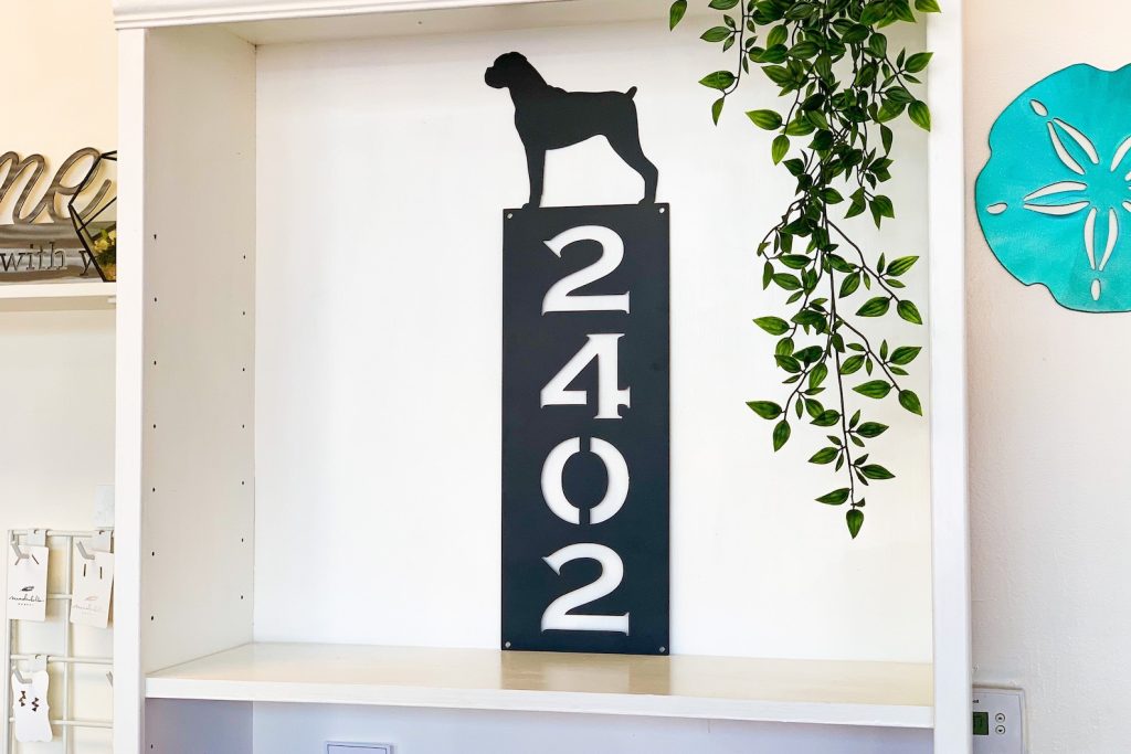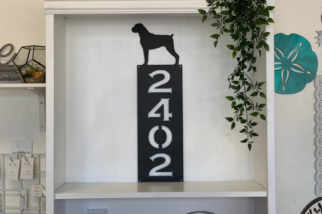 Be the first to review “Vertical Dog Silhouette Metal Address Sign – Outdoor Decor”